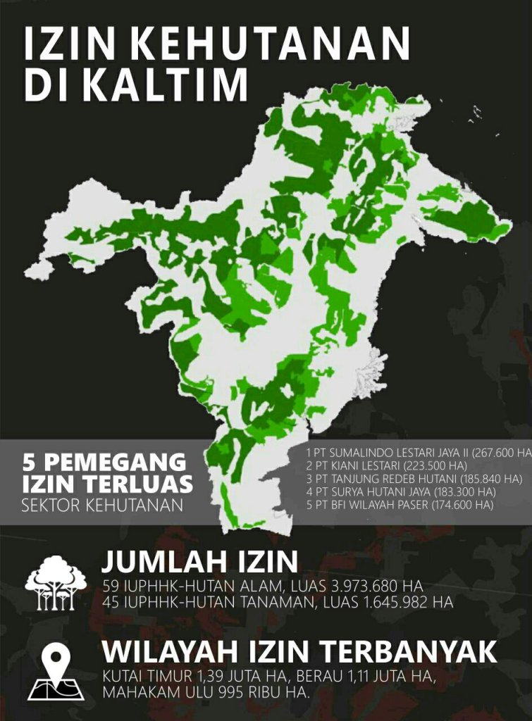 Izin kehutanan adalah jenis konsesi terluas yang terbit di daratan Kaltim. Berdasarkan catatan Dinas Kehutanan Kaltim yang diterima C.I.News, total izin sektor ini menembus 5.619.662 hektare. Seluruhnya terdiri dari 59 IUPHHK-HA dengan luas 3.973.680 hektare; dan 45 IUPHHK-HTI seluas 1.645.982 hektare. Dapat dikatakan bahwa 44,09 persen daratan provinsi dikuasai izin kehutanan.