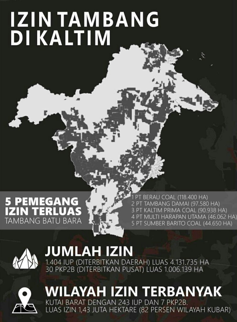 Sebanyak 40 persen dari luas daratan kabupaten adalah izin tambang. Satu-satunya daerah di Kaltim yang tanahnya tak berstempel izin pertambangan batu bara adalah Balikpapan.