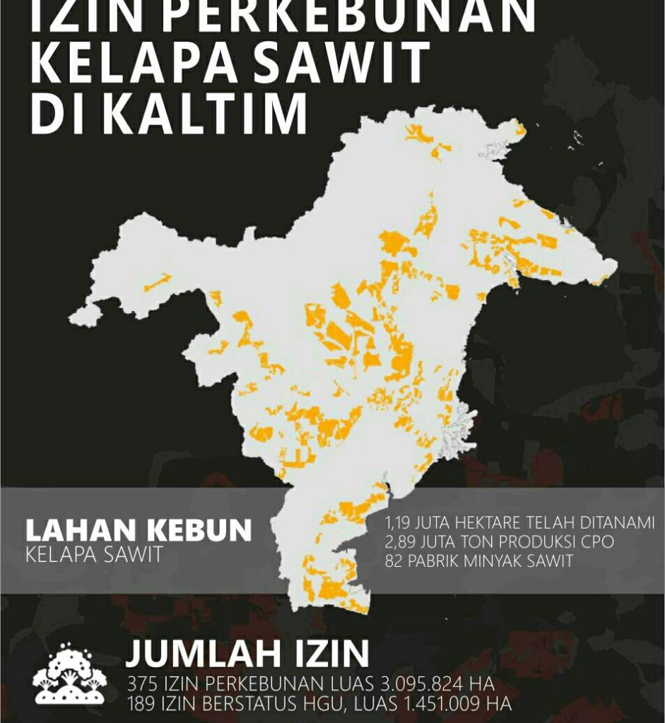 Sejak 15 tahun terakhir, bupati dan wali kota ramai-ramai menerbitkan izin perkebunan. Meminjam data dari Dinas Perkebunan Kaltim, total konsesi yang telah diterbitkan mencapai 375 izin dengan luas 3.095.824 hektare. Angka tersebut setara dengan 23,62 persen daratan Kaltim. Dari luas tersebut, sebanyak 189 izin telah berstatus hak guna usaha atau HGU dengan luas 1.159.880 hektare.