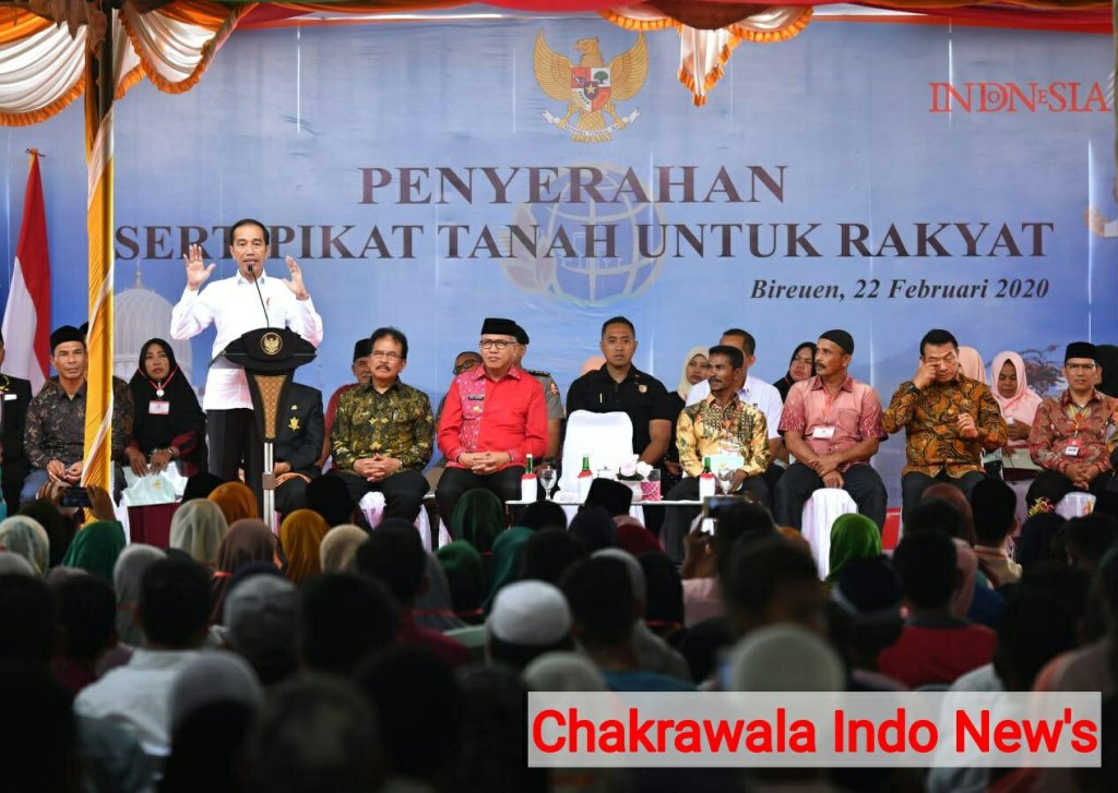 Chakrawala Indo New’s – Bireuen_Sebanyak 2.576 pemilik bidang tanah dari sejumlah kabupaten dan kota di Provinsi Aceh hari ini memperoleh sertifikat atas tanah yang mereka miliki. Bertempat di Lapangan Futsal Galacticos Cot Gapo, Kabupaten Bireuen, pada Sabtu, 22 Februari 2020, Presiden Joko Widodo menyerahkan langsung ribuan sertifikat tersebut sebagai bagian dari kunjungan kerja Presiden ke Provinsi Aceh.