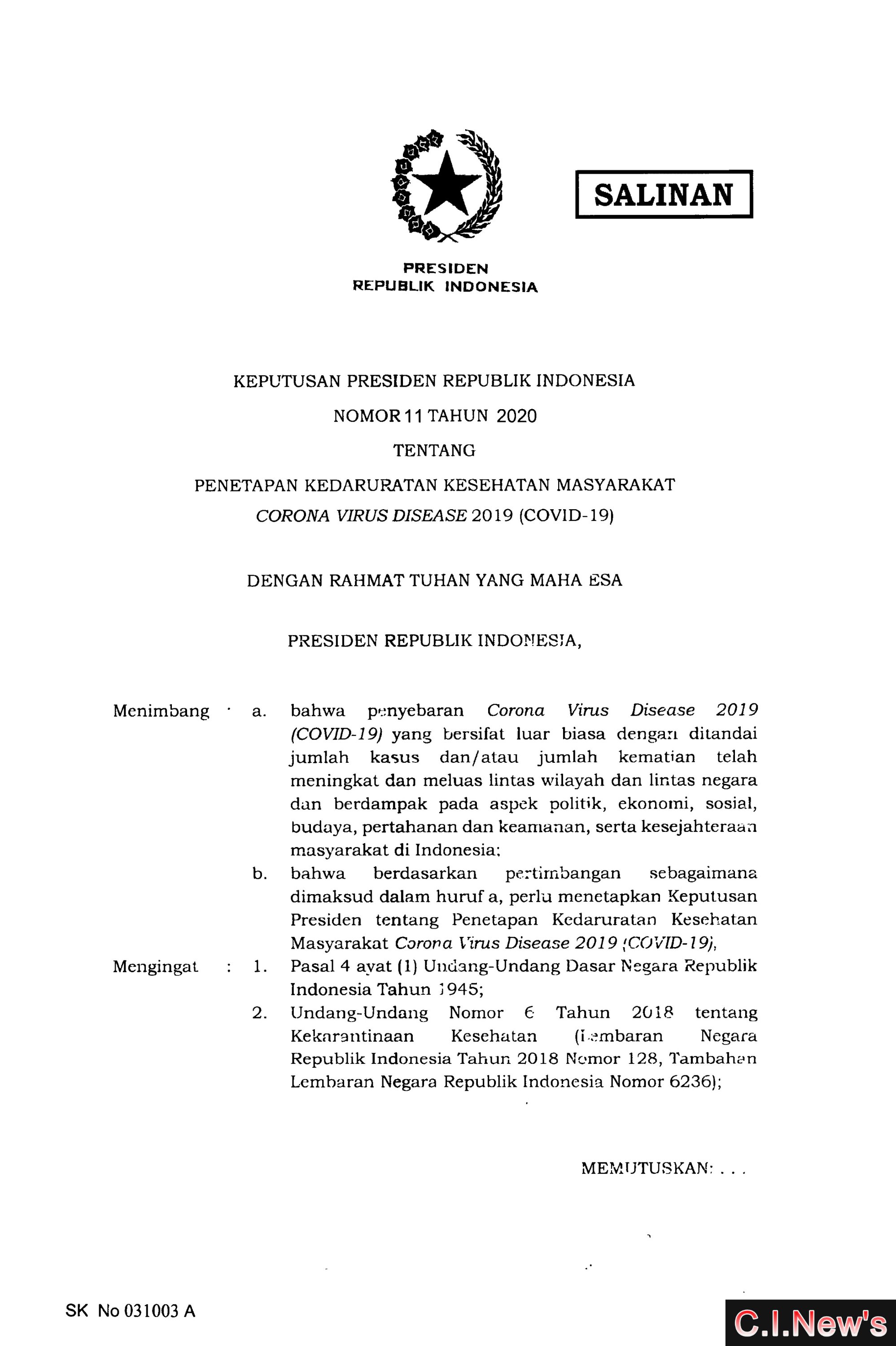 Berdasarkan pertimbangan tersebut, Presiden Joko Widodo (Jokowi) menetapkan Keputusan Presiden (Keppres) Nomor 11 Tahun 2020 tentang Penetapan Kedaruratan Kesehatan Masyarakat Corona Virus Disease 2019 (Covid-19). (Tautan: https://jdih.setkab.go.id/PUUdoc/176084/Keppres_Nomor_11_Tahun_2020.pdf)