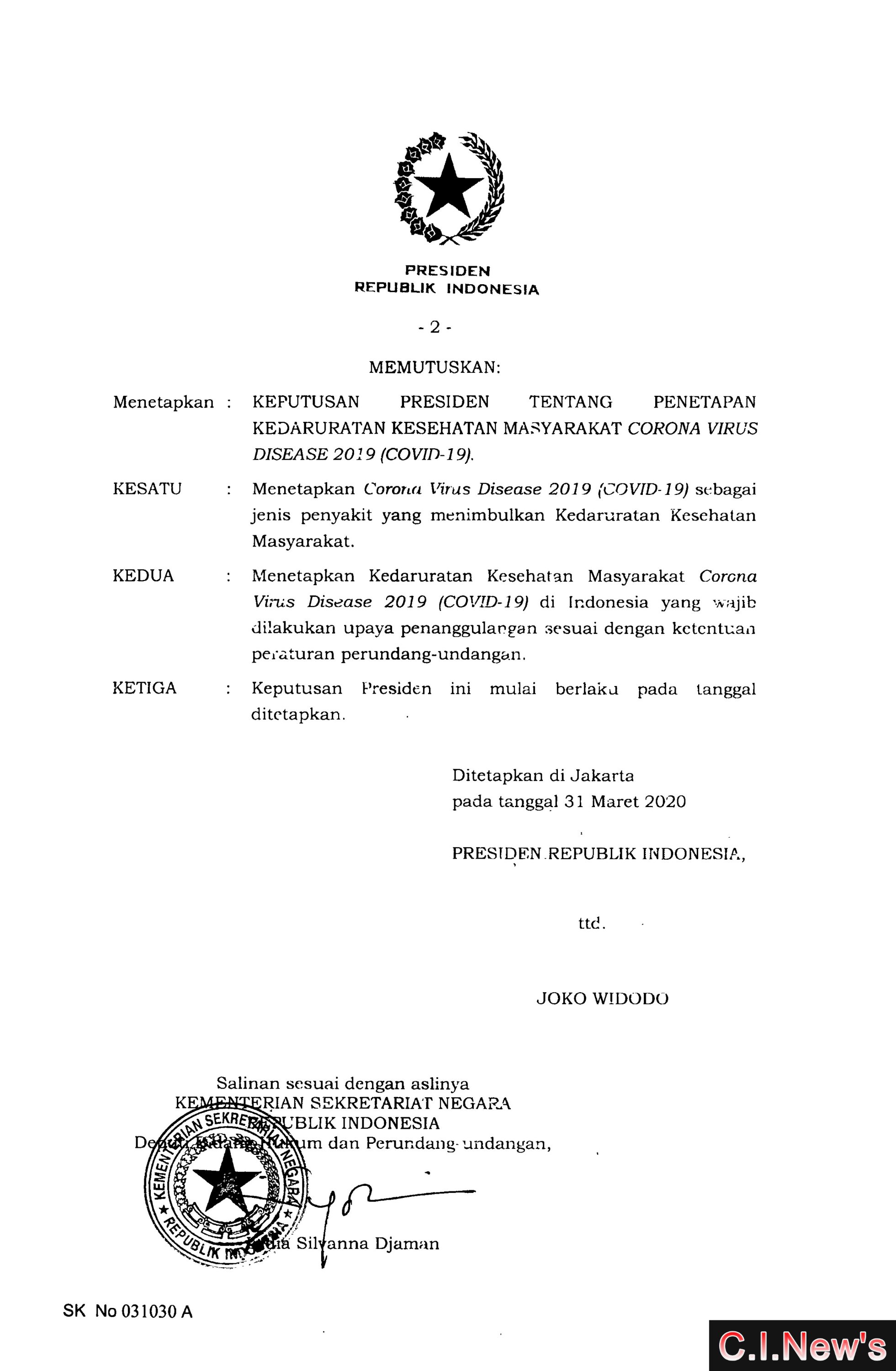 Di lansir dari situs resmi pemerintah oleh C.I.New’s, Menurut Keppres ini, Presiden juga menetapkan Kedaruratan Kesehatan Masyarakat Corona Virus Disease 2019 (Covid-19) di lndonesia yang wajib dilakukan upaya penanggulangan sesuai dengan ketentuan peraturan perundang-undangan.