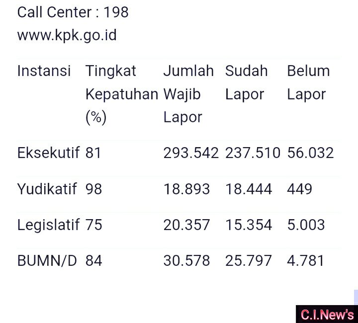 Berdasarkan jumlah instansi, tercatat baru 280 dari 1.397 instansi yang telah mencapai angka 100 persen dalam pelaporan harta kekayaan penyelenggara negaranya. Jumlah 280 instansi tersebut terdiri dari 127 instansi di bidang eksekutif, 124 DPRD tingkat Provinsi/Kabupaten/Kota dan 29 instansi BUMN/D.
