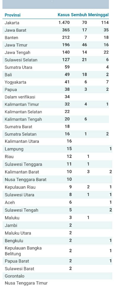 Berdasarkan data terkini, virus corona telah menyebar ke 32 provinsi di Indonesia. Provinsi dengan kasus terbanyak adalah DKI Jakarta, Jawa Barat, Banten, Jawa Timur, dan Jawa Tengah.