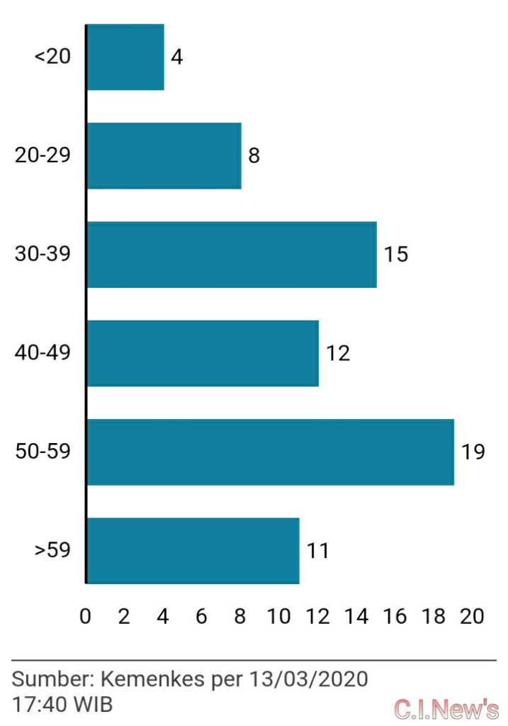 Dalam data 69 orang pasien awal yang dirawat karena positif virus corona di Indonesia hingga 13 Maret 2020, lebih dari separuhnya berusia lebih dari 40 tahun.
