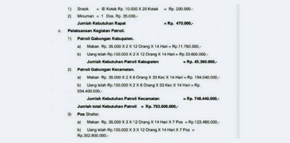 Dari total keseluruhan Rp 1.4 miliar anggaran, sebagian besar anggaran akan terserap untuk pelaksaanaan kegiatan patroli yang akan menghabiskan Rp 1.270.080.000. Jumlah itu hanya untuk uang makan dan uang lelah.