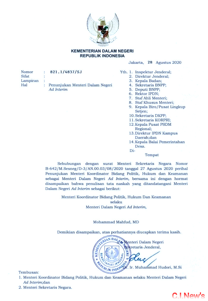 “Sebubungan dengan surat Menteri Sekretaris Negara Nomor B-642/M.Sesneg/D-3/AN.00.03/08/2020 tertanggal 27 Agustus 2020 perihal penunjukan Menteri Koordinator Bidang Politik Hukum dan Keamanan sebagai Menteri Dalam Negeri,” begitu bunyi surat tersebut.
