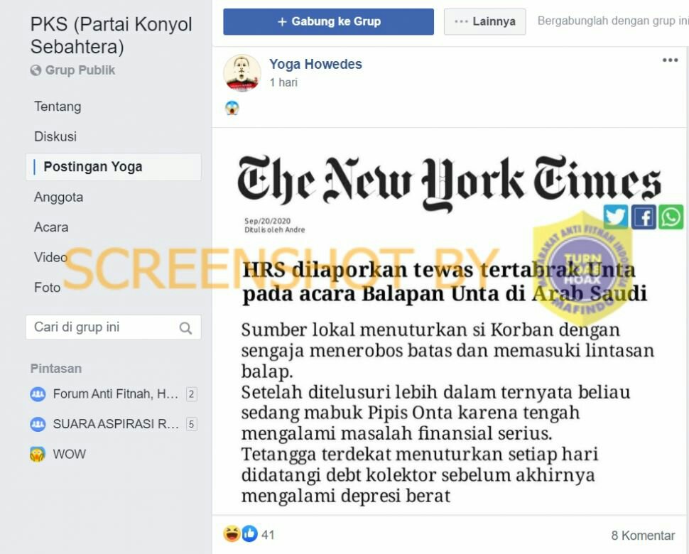 Akun tersebut mengunggah foto tangkapan layar artikel dari The New York Times berjudul ‘HRS dilaporkan tewas tertabrak unta pada acara balapan unta di Arab Saudi’ yang tayang pada 20 September 2020.