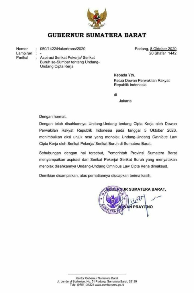 Dalam surat tersebut tertulis menyusul surat sebelumnya dengan nomor 019/ 896/FPP-2020 telah dilakukan aksi penolakan oleh BEM se Sumbar, HMI, PMII dan organisasi lainnya menolak UU Cipta Kerja dan pihaknya mewakili masyarakat Sumbar meminta Presiden RI tidak melaksanakan UU tersebut dan membuat Perpu.