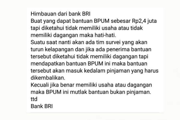 Akun Facebook Sunanto pada Jumat (30/10/2020) menulis status berisi imbauan dari Bank BRI. Imbauan tersebut mengingatkan penerima Bantuan Produktif Usaha Mikro (BPUM) sebesar Rp2,4 juta untuk berhati-hati.