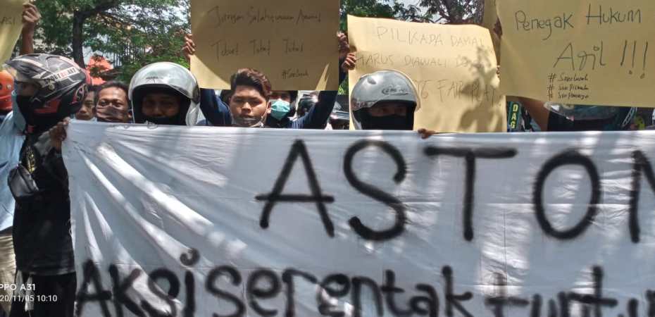 PONOROGO — Aksi masa Aliansi Masyarakat Peduli Ponorogo mengelar demo di depan Kantor Bawaslu, Kejaksaan dan Polres, Mereka menutut tindakan terkait beberapa oknum penyelenggara negara yang ikut dalam pemenangan pilkada.