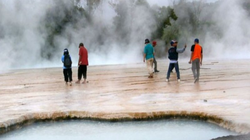 Under the hardened expanse like storing a hot spring that never runs out and continues to explode, in some parts there are large ones that form puddles or ponds, and small ones and drain warm water.(Ibn)