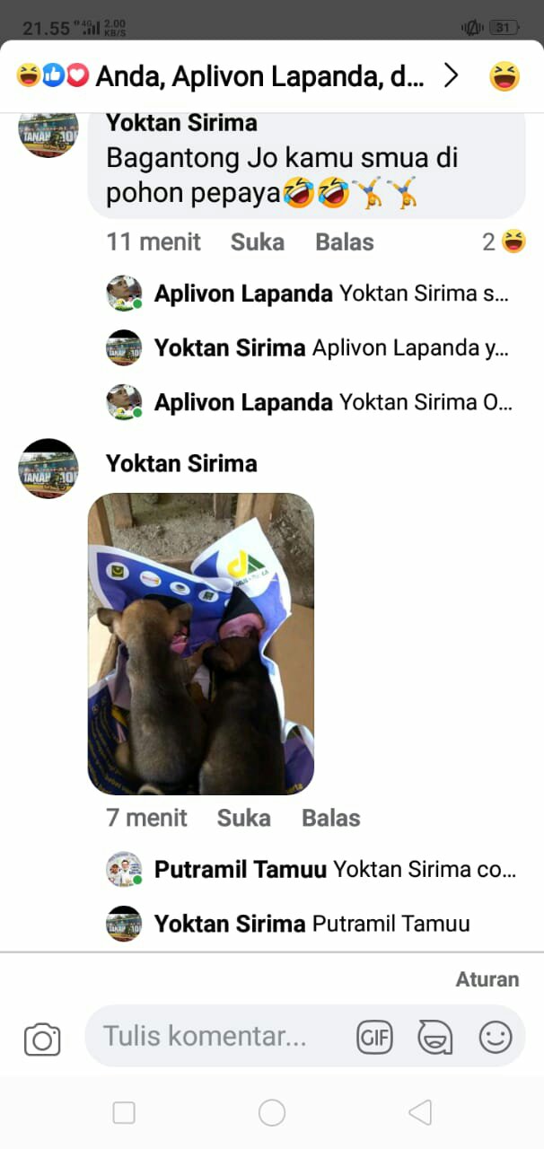 Tetapi komentar yang ditulis akun Yoktan Sirima juga mengirim gambar pasangan calon Delis Julkarson Hehi dan Djira “DIA” yang ditindis dengan anak anjing.