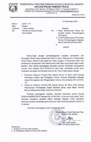 Dalam surat resmi yang diterbitkan hari ini, Minggu (15/11/2020), langsung ditandatangani Kepala Satpol PP DKI Jakarta Arifin.