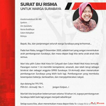 “Hari Rabu, 9 Desember 2020, adalah hari yang sangat menentukan arah pembangunan Surabaya, dan masa depan anak-anak kita semua. Mari kita pilih Calon Wali Kota Eri Cahyadi dan Calon Wakil Wali Kota Armudji. Pasangan nomor 1 ini memiliki kompetensi, amanah, dan telah teruji sebagai birokrat dan sebagai anggota DPRD Surabaya,” demikian tulis Risma di suratnya.