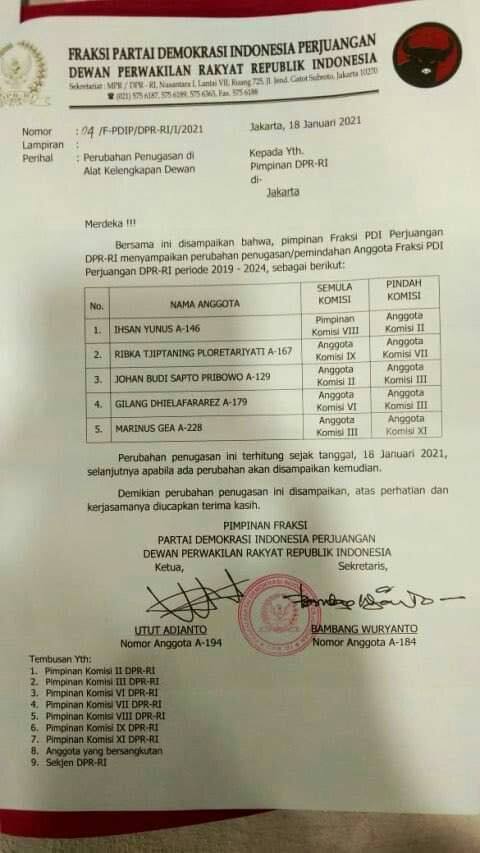 Fraksi PDIP DPR melakukan rotasi pada anggotanya di Parlemen. Total ada lima anggota yang dirotasi, hal itu tertuang dalam surat Fraksi PDIP DPR RI Nomor 04/F-PDIP/DPR-RI/I/2021, yang ditandatangani oleh Ketua Fraksi Utut Adianto dan Sekretaris Fraksi Bambang Wuryanto.