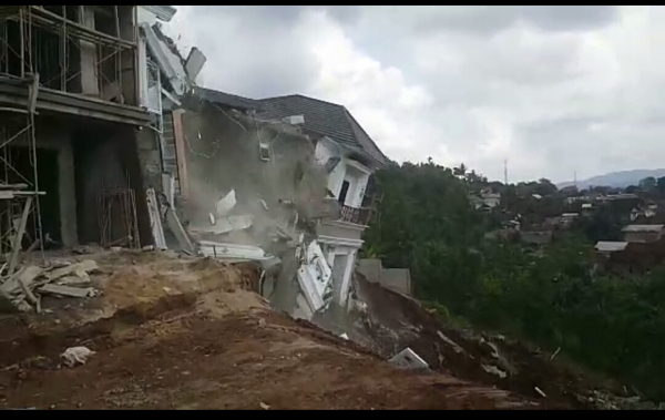 Ambruknya dua unit rumah yang dibangun di ujung bukit, Blok 9 Davinci itu diduga akibat kontur tanah yang tidak padat sehingga longsor. (HERI)