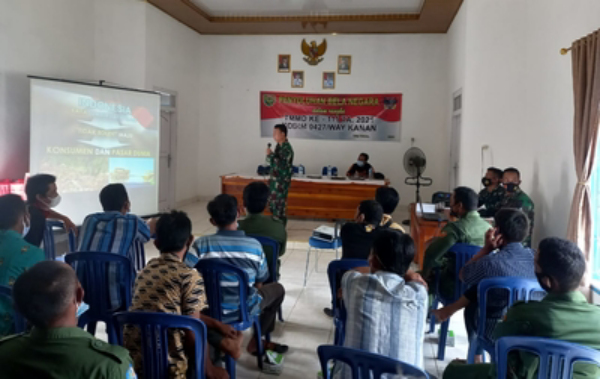Di hadapan puluhan aparatur kampung dan masyarakat, Pasiter Kapten Inf A.Yani Folsen memberikan materi Bela Negara yang meliputi kerakyatan, kesemestaan, kewilayahan, serta pertahanan Negara.