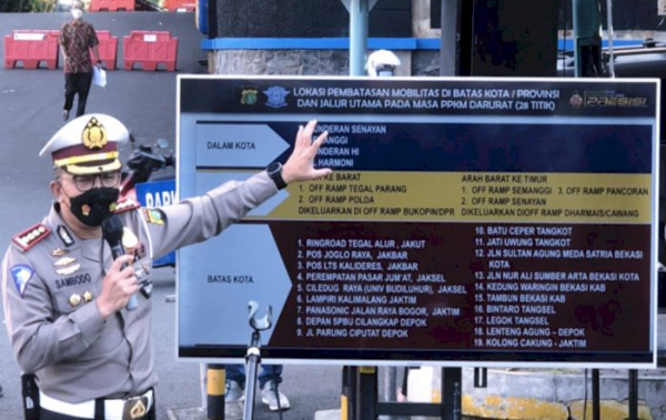 “Untuk melakukan PPKM darurat ini ada 63 titik yang kita akan kita jaga,” kata Dirlantas Polda Metro Jaya Kombes Sambodo Purnomo Yogo di Mapolda Metro Jaya, Jakarta pada, Jumat (2/7/2021).
