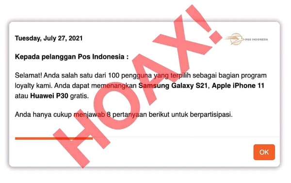 “Sahabat kalau kamu ada yang dapat info tentang Pos Indonesia bagi-bagi hadiah Hp dll kaya di atas 👆 hati-hati ya, karena itu berita hoax, selalu cek dan ricek dulu sebelum kamu jadi korban penipuan phishing oke,” terang Pos Indonesia dalam keterangan tertulisnya pada, Kamis (29/7/2021).