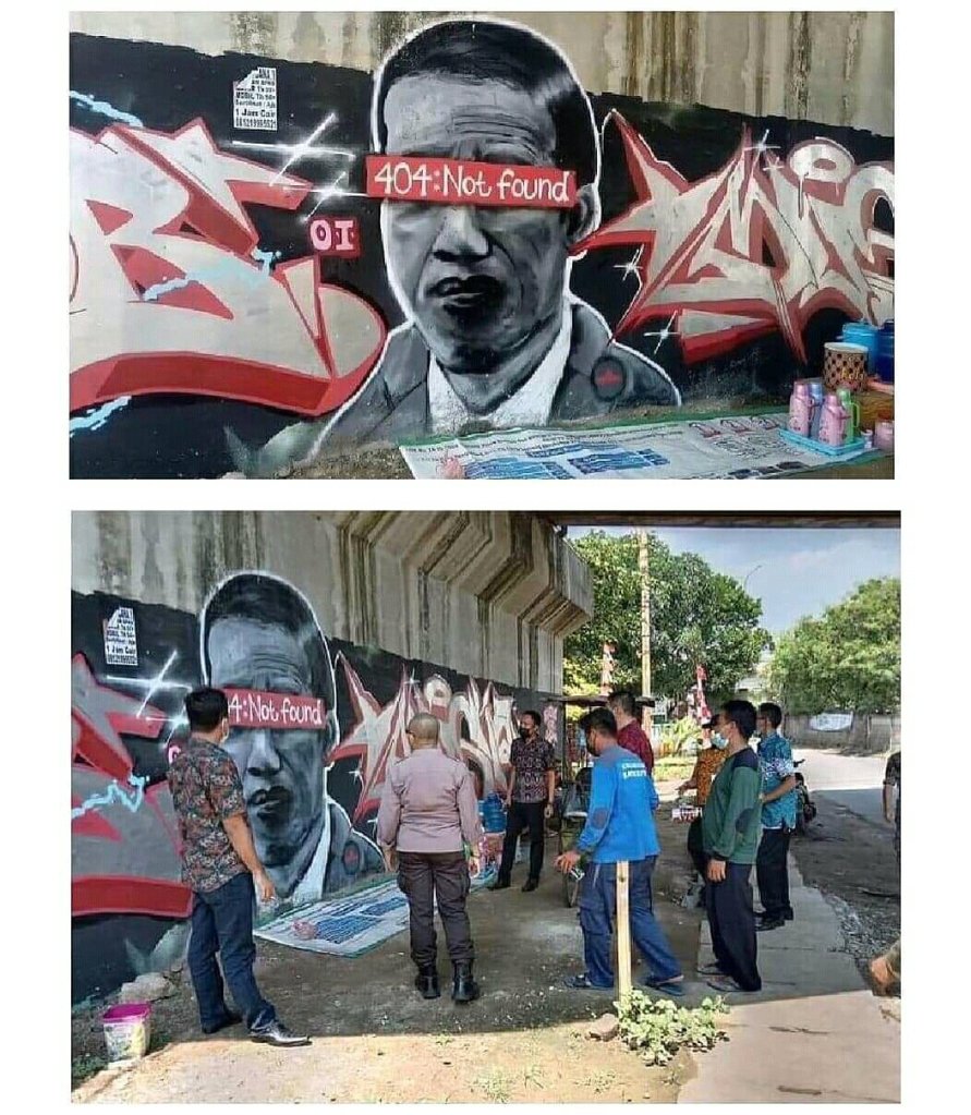 Selanjutnya, pada Jumat (13/8/2021) ditemukan mural yang diduga wajah Presiden dan terdapat tulisan ‘404: Not Found di Batuceper, Tangerang, Banten. Polisi dan jajaran aparat terkait kini menghapus mural itu.
