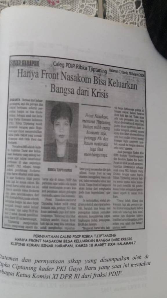 JAKARTA — Politikus Partai Demokrasi Indonesia Perjuangan (PDIP) Ribka Tjiptaning membuat pernyataan di Harian Sinar Harapan pada, 18 Maret 2004 ‘Hanya Front Nasakom Bisa Keluarkan Bangsa dari Krisis.’