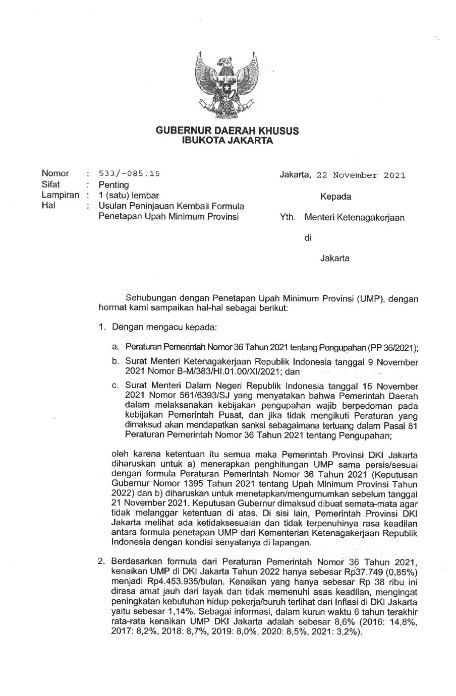 Dalam surat itu, Anies menjelaskan Pemerintah Provinsi DKI Jakarta diharuskan untuk menerapkan penghitungan UMP sama persis atau sesuai dengan formula Peraturan Pemerintah Nomor 36 Tahun 2021yang dituangkan kembali menjadi Keputusan Gubernur Nomor 1395 tahun 2021 tentang Upah Minimum Provinsi Tahun 2022.