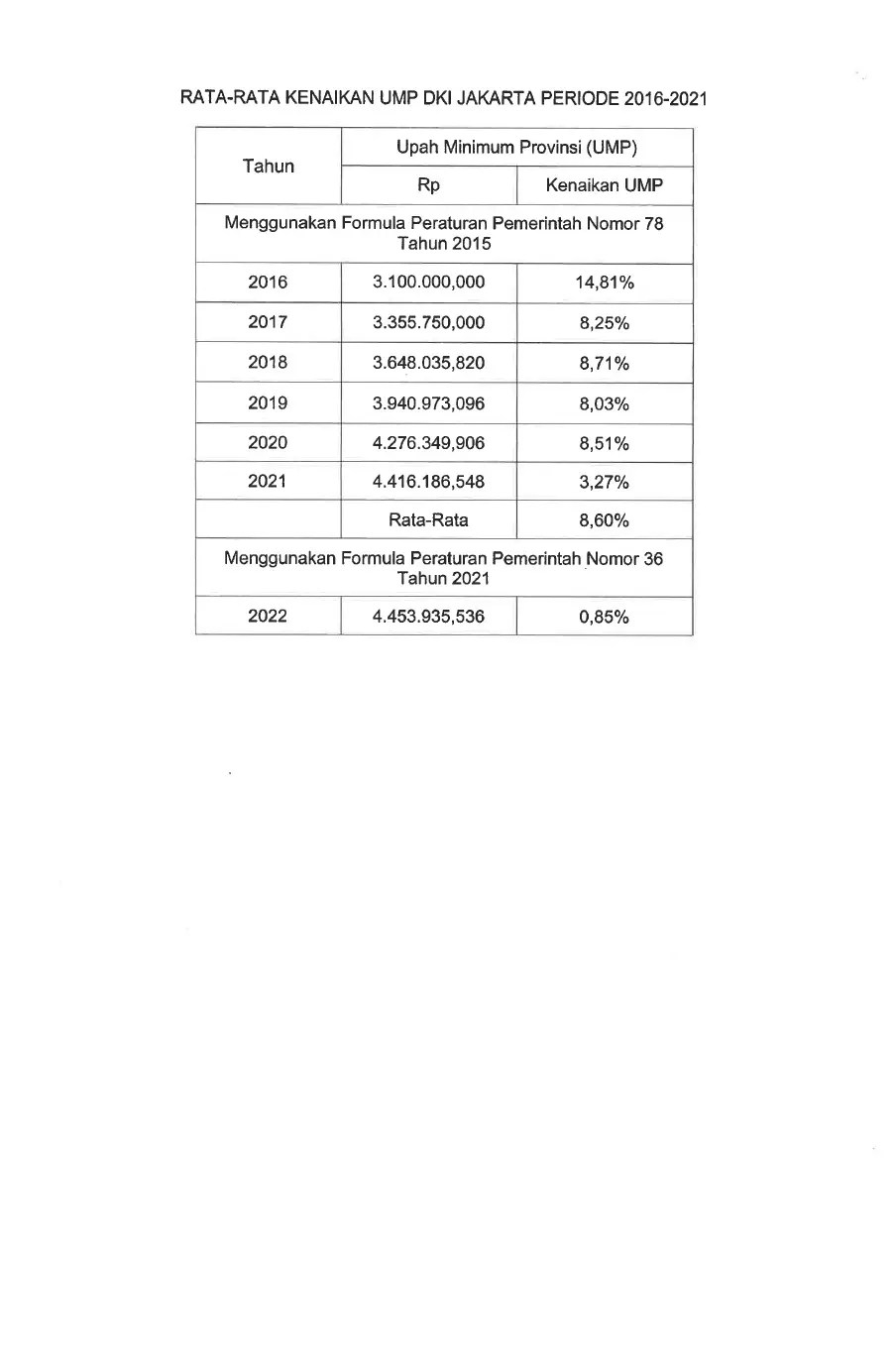 Berdasarkan formula dari Peraturan Pemerintah Nomor 36 Tahun 2021, kenaikan UMP di DKI Jakarta tahun 2022 hanya sebesar Rp37.749 atau 0,85 persen menjadi Rp4.453.935 per bulan.