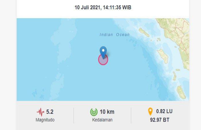 JAKARTA — Gempa bumi dengan magnitudo 5 terjadi di Sinabang, Kabupaten Simeulue, Aceh, Sabtu (4/12) malam pukul 22.29 WIB.