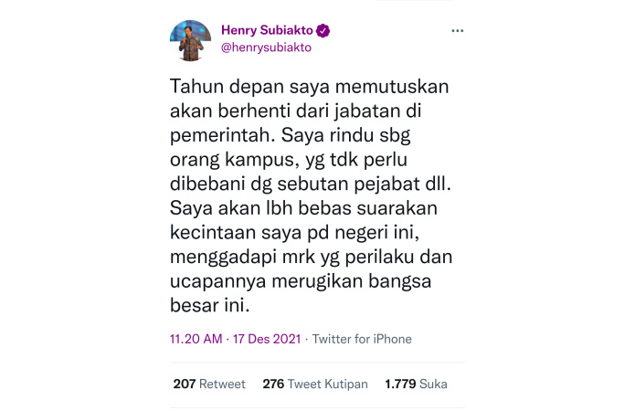 “Tahun depan saya memutuskan akan berhenti dari jabatan di pemerintah,” kata Henry Subiakto dikutip dari akun Twitternya, Jumat (17/12).
