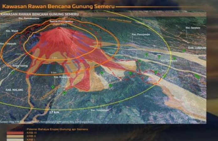 - Mewaspadai potensi awan panas guguran (APG), guguran lava, dan lahar di sepanjang aliran sungai/lembah yang berhulu di puncak Gunung Semeru, terutama sepanjang Besuk Kobokan, Besuk Bang, Besuk Kembar, dan Besuk Sat serta potensi lahar pada sungai-sungai kecil yang merupakan anak sungai dari Besuk Kobokan.