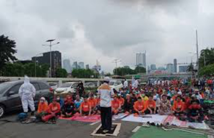 Massa buruh yang terdiri dari KSPI, ORI, KPBI, SPI, JALA PRT, Buruh Migrant, Urban Poor Consortium, guru dan tenaga honorer, organisasi perempuan PERCAYA, dan 60 federasi serikat pekerja di tingkat nasional ini shalat Jumat di jalanan.
