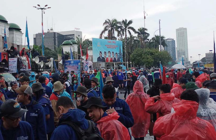 JAKARTA — Konfederasi Serikat Pekerja Seluruh Indonesia (KSPSI) pimpinan Jumhur Hidayat melakukan aksi unjuk rasa di depan Gedung DPR RI, Senayan, Jakarta, Rabu (23/3/2022). Dalam aksinya mereka mendesak UU Omnibus Law Cipta Kerja dihapus.
