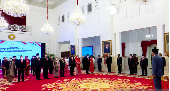 Pelantikan itu berdasarkan Keputusan Presiden Nomor 33P Tahun 2022 tentang Pemberhentian dan Pengangkatan Anggota KPU dan Keputusan Presiden Nomor 34P Tahun 2022 tentang Pemberhentian dan Pengangkatan Anggota Bawaslu.