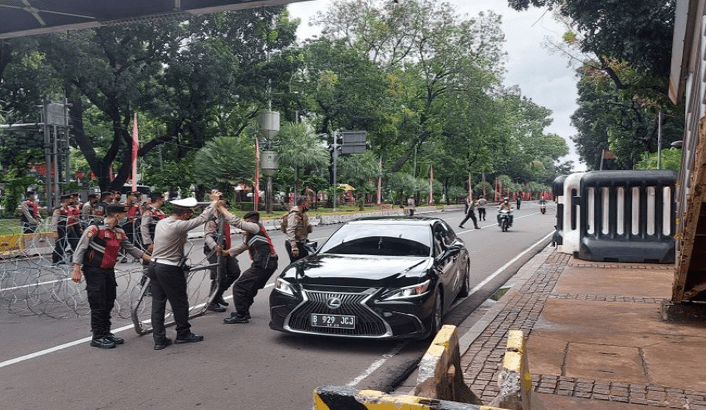 Personel Brimob mulai membentangkan dua lapis pagar kawat berduri di bawah jembatan penyeberangan di depan Gedung Sapta Pesona pada pukul 14.10 WIB. Ratusan petugas Kepolisian juga berjaga di balik pagar kawat berduri