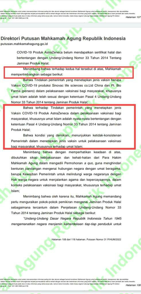 Keputusan MA tersebut diambil dalam judicial review Peraturan Presiden (Perpres) Nomor 99/2020 tentang Pengadaan Vaksin.