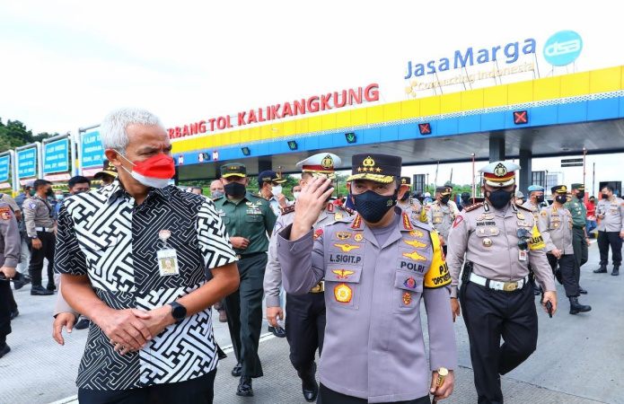 SEMARANG –Kapolri Jenderal Listyo Sigit Prabowo bersama dengan Gubernur Jawa Tengah (Jateng) Ganjar Pranowo beserta stakeholder lainnya meninjau langsung Pos Terpadu Gerbang Tol Kalikangkung KM 414 untuk memastikan kesiapan pelayanan mudik Lebaran 2022.