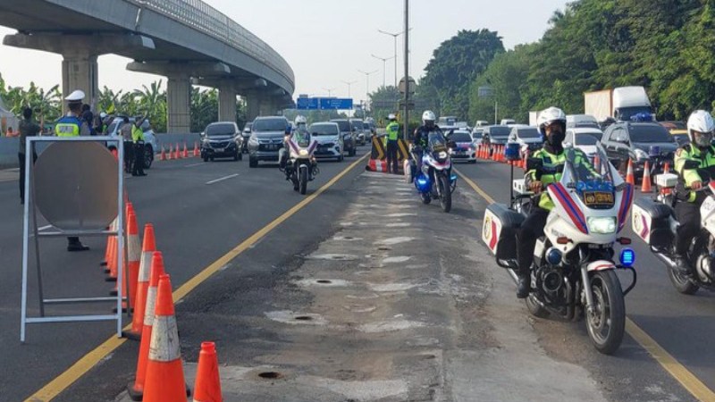 JAKARTA – Petugas melakukan rekayasa lalu lintas berupa one way dan contra flow di jalan Tol Cipali hingga Tol Jakarta-Cikampek dari arah Jawa Tengah, Barat dan lainnya menuju Jakarta dan sekitarnya karena sudah cukup padat.