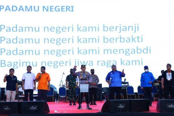 Sebelum mengakhiri sambutannya, Sigit pun memimpin para buruh untuk menyanyikan salah satu lagu wajib nasional berjudul Bagimu Negeri. Kapolri dan buruh pun larut bernyanyi bersama di acara tersebut.