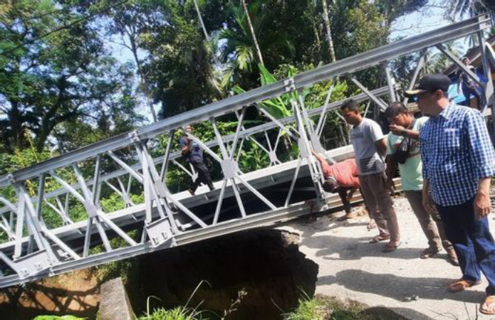 “Sebenarnya saya takut naik jembatan (darurat) ini karena kondisi tanah penyangganya sudah parah tapi mau bagaimana lagi ini merupakan jalan terdekat dan akses utama,” ujarnya.