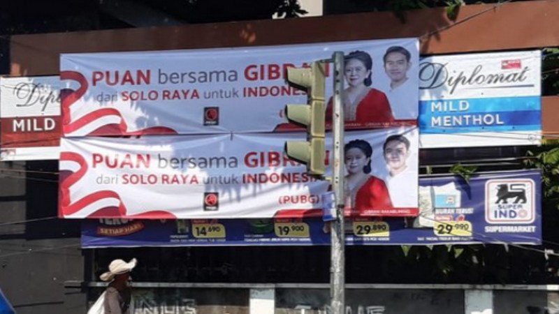 SOLO – Sejumlah spanduk bergambar Wali Kota Surakarta Gibran Rakabuming Raka dengan Ketua DPR Puan Maharani muncul di sejumlah titik di Solo Raya, antara lain, di kawasan Kartasura, Kabupaten Sukoharjo, dan beberapa titik di Kota Solo, Jawa Tengah.