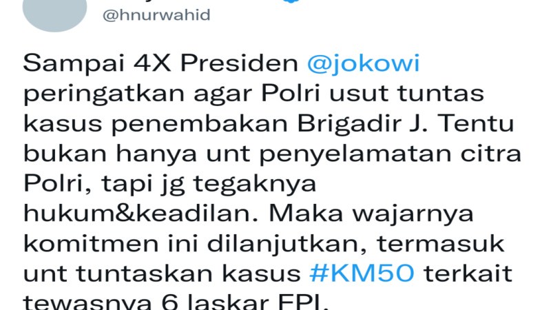 “Sampai 4 kali Presiden @jokowi peringatkan agar Polri usut tuntas kasus penembakan Brigadir J. Tentu bukan hanya untuk penyelamatan citra Polri, tapi juga tegaknya hukum dan keadilan. Maka wajarnya komitmen ini dilanjutkan, termasuk untuk tuntaskan kasus #KM50 terkait tewasnya 6 laskar FPI,” cuit HNW di akun Twitter resminya @hnurwahid, Selasa (9/8).