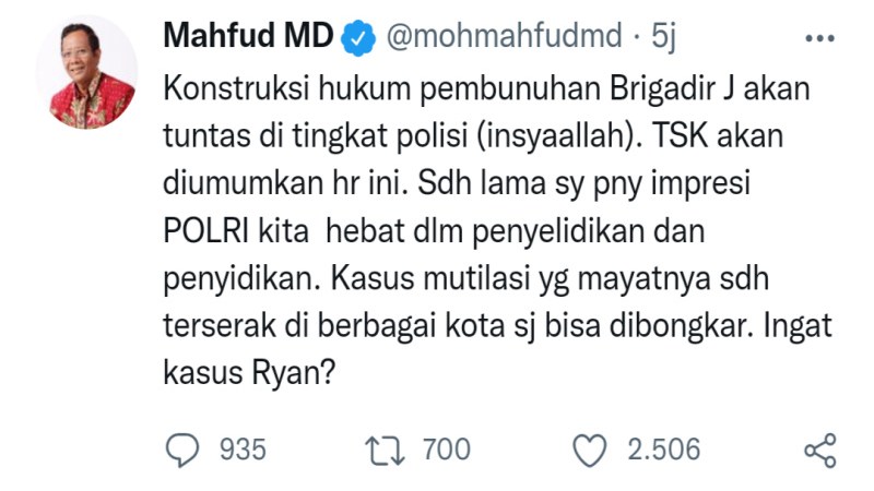 “Konstruksi hukum pembunuhan Brigadir J akan tuntas di tingkat polisi, insyaallah,” ucap Mahfud dalam cuitannya di akun resmi Twitter dengan nama pengguna mohmahfudmd di kutip CIN pada, Selasa 9 Agustus 2022.