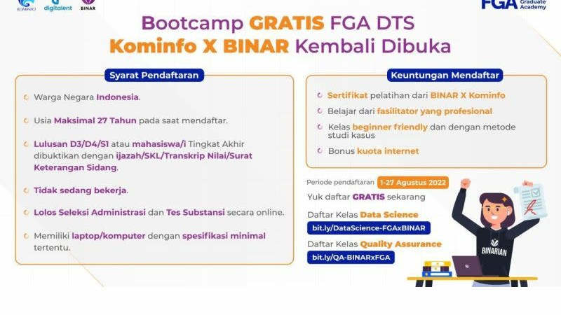 Periode pendaftaran dimulai hingga 27 Agustus 2022, untuk kelas Data Science, daftar di laman http://bit.ly/DataScience-FGAxBINAR sementara untuk kelas Quality Assurance melalui laman berikut: http://bit.ly/QA-BINARxFGA.