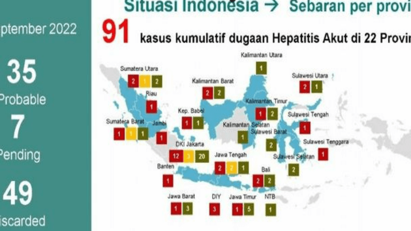 JAKARTA – Kementerian Kesehatan (Kemenkes) mendeteksi total 91 kasus penyakit Hepatitis Akut yang belum diketahui penyebabnya pada pasien di bawah usia 16 tahun di 22 provinsi hingga Kamis (15/9).