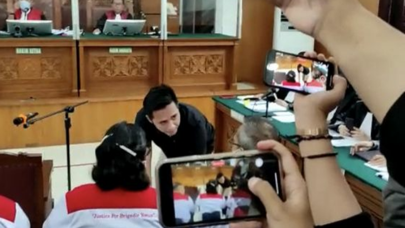 Nampak Bharada E yang menggunakan pakaian kemeja hitam menghampiri orang tua Brigadir J. Kemudian dia menundukan kepala ke arah kaki orang tua Yosua Hutabarat atau Brigadir J.