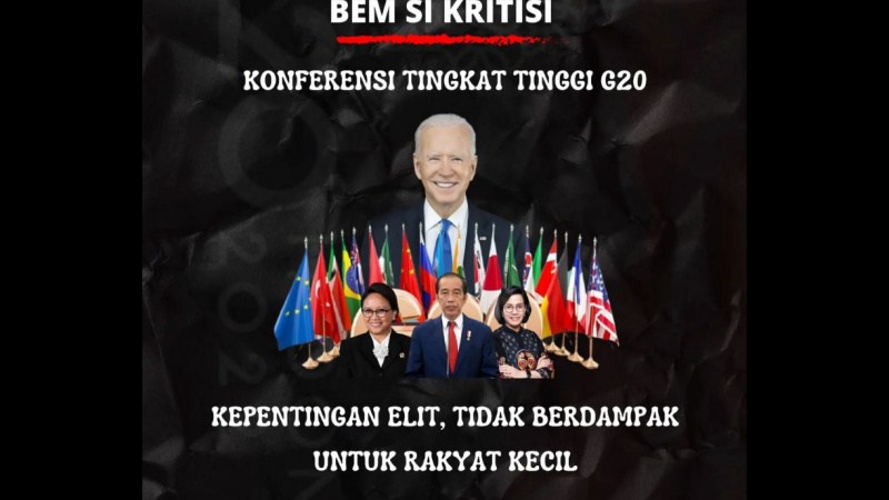 “KTT G-20 ini adalah sebuah proyek yang digagas oleh imperialis utama, yaitu Amerika Serikat untuk melancarkan kepentingan negaranya demi melanggengkan posisinya pada kuasa adidaya dunia,” tulis BEM SI yang dipimpin oleh Presiden Mahasiswa IPB Muhammad Yuza Augusti dikutip CIN pada, Minggu (13/11).