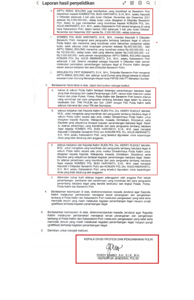 “Sehubungan dengan rujukan di atas, disampaikan kepada Jenderal bahwa Divpropam Polri telah melaksanakan penyelidikan adanya penambangan batubara ilegal di wilayah Polda Kalimantan Timur yang diduga dibekingi dan dikoordinir oleh oknum anggota Polri dan Pejabat Utama Polda Kaltim,” seperti bunyi surat laporan hasil penyelidikan Divpropam Polri bernomor: R/1253/IV/WAS.2.4/2022/Divpropam tertanggal 7 April 2022 seperti dikutip pada, Jumat (18/11).