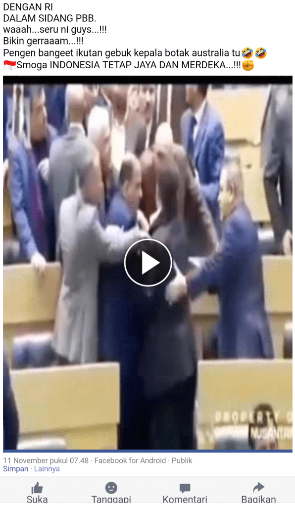 JAKARTA — Sebuah video di Facebook menarasikan bahwa Australia menyerang Indonesia di sidang Perserikatan Bangsa-Bangsa (PBB) terkait sengketa Kepulauan Pasir.