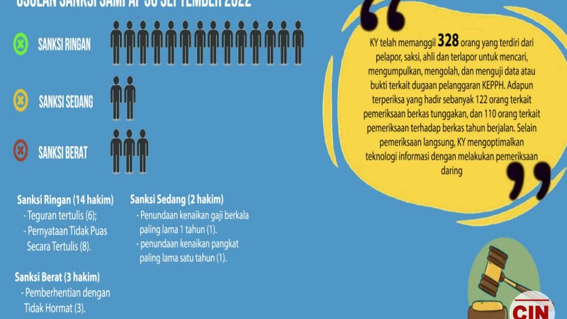 JAKARTA – Sepanjang periode 2022 Komisi Yudisial (KY) mengusulkan 19 hakim dijatuhi sanksi ringan hingga berat karena terbukti melanggar Kode Etik dan Pedoman Perilaku Hakim (KEPPH).